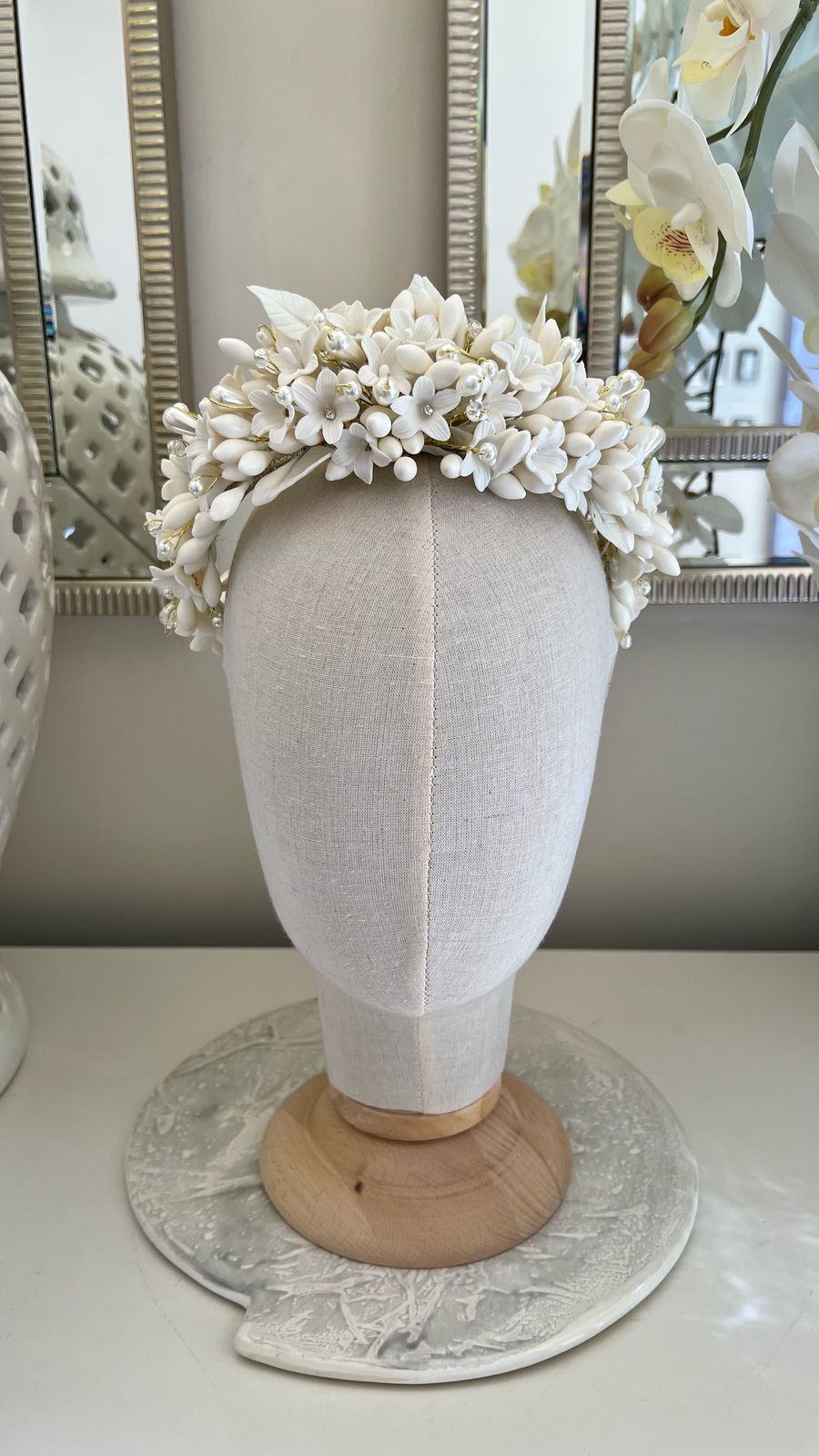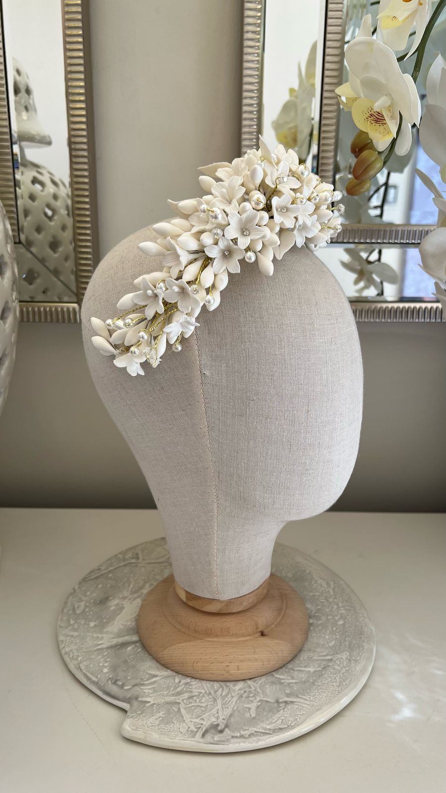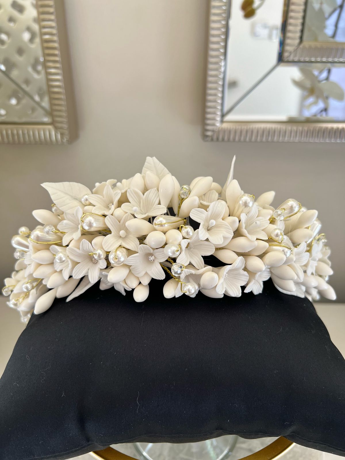El Tocado Mia es una pieza artesanal hecha con cera natural, decorado con flores de pasta francesa y perlas. Su diseño flexible te permite ajustarlo fácilmente. Disfruta de un toque único y natural en tu peinado con este tocado de alta calidad.