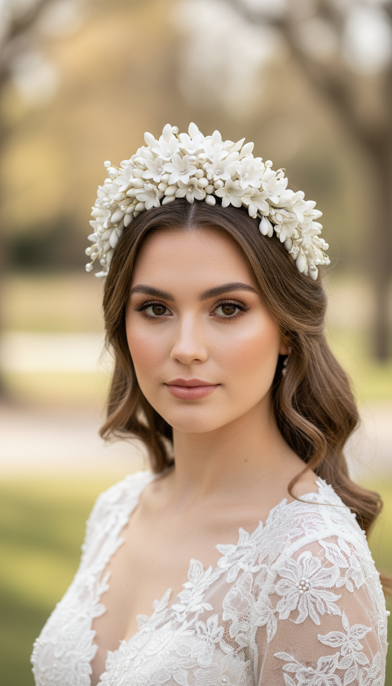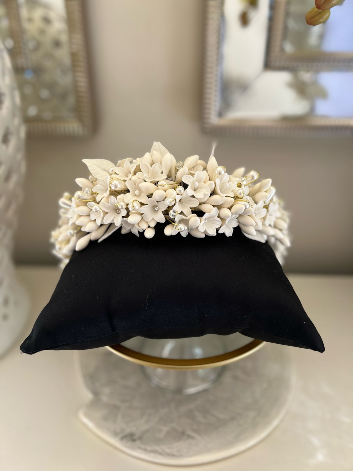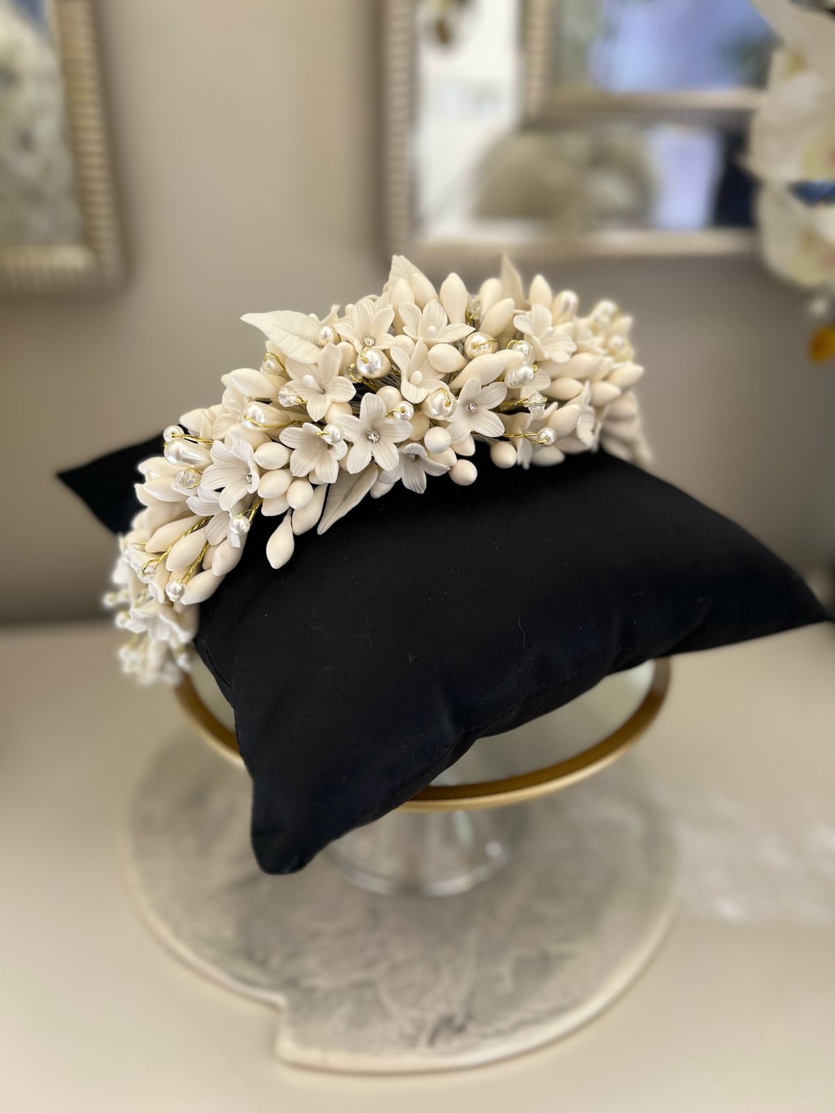 El Tocado Mia es una pieza artesanal hecha con cera natural, decorado con flores de pasta francesa y perlas. Su diseño flexible te permite ajustarlo fácilmente. Disfruta de un toque único y natural en tu peinado con este tocado de alta calidad.