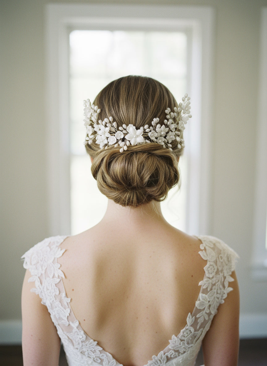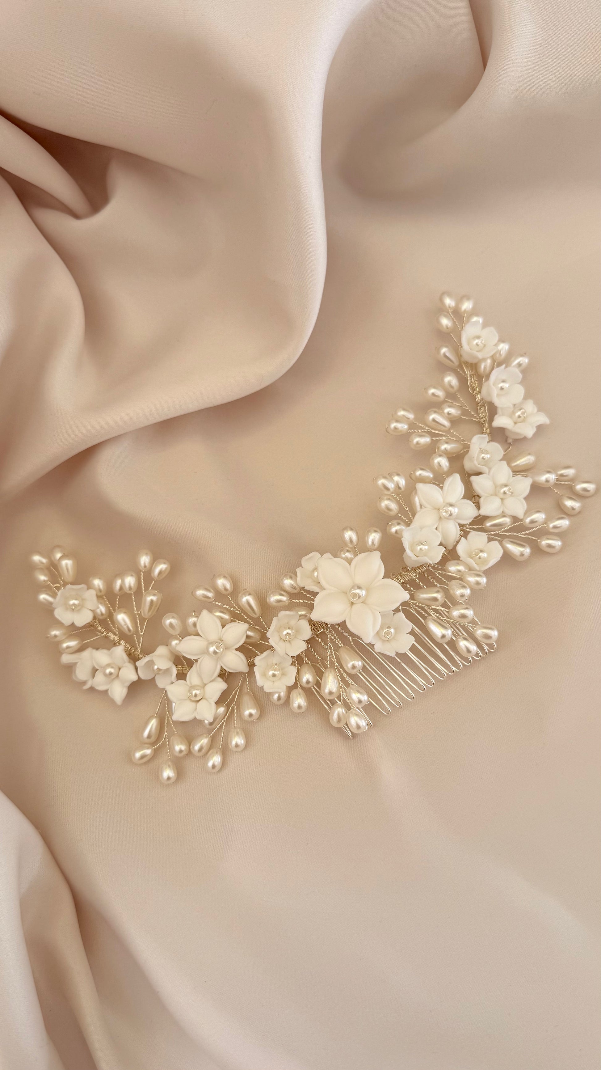 Tocado de flores elaboradas en pasta francesa, adornado con delicadas perlas en tono blanco natural y montado sobre un soporte plateado.